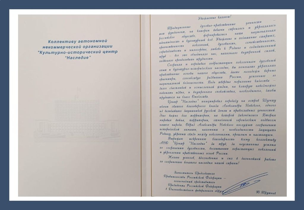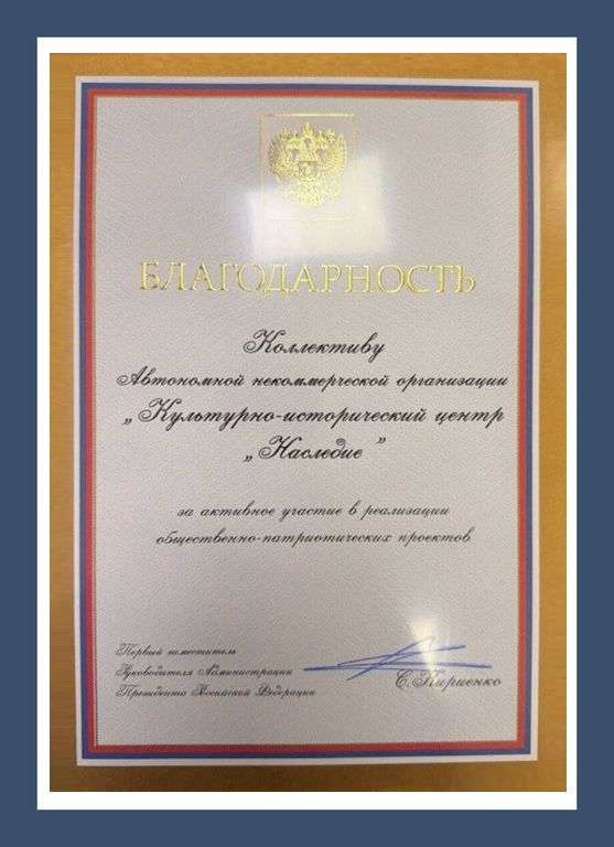 За активную и плодотворную деятельность, направленную на реализацию общественно значимых проектов и программ, способствующих содействию сохранения культурного, исторического, духовного наследия России, оказанию гуманитарной помощи нуждающимся, Центр "Наследие" награжден Благодарностями, Благодарственными письмами и медалями.